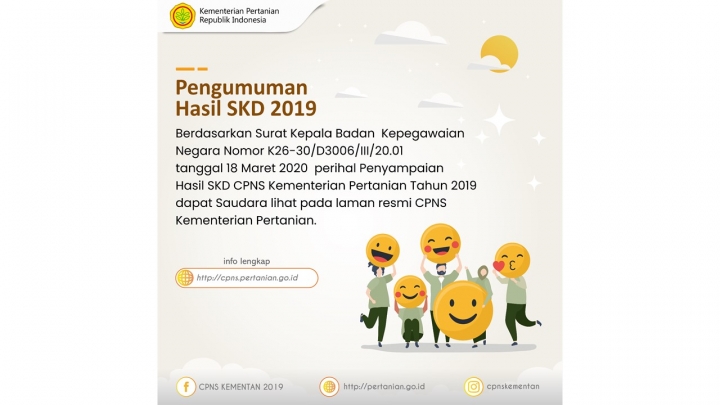 Berdasarkan Surat Kepala Badan Kepegawaian Negara Nomor K26-30/D3006/III/20.01 tanggal 18 Maret 2020 perihal Penyampaian Hasil SKD CPNS Kementerian Pertanian Tahun 2019, disampaikan hal-hal sebagai berikut: