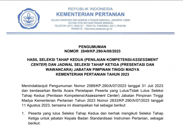 PENGUMUMAN Hasil Seleksi Tahap Kedua (Penilaian Kompetensi/Assessment Center) dan Jadwal Seleksi Tahap Ketiga (Presentasi dan Wawancara) Jabatan Pimpinan Tinggi Madya Kementerian Pertanian Tahun 2023