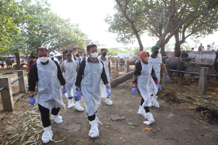 Menteri Pertanian Syahrul Yasin Limpo (Mentan SYL) meninjau pelaksanaan vaksinasi penyakit mulut dan kuku (PMK) di Kabupaten Grobogan sekaligus memberikan bantuan obat-obatan. Selain untuk mempercepat penyembuhan PMK, vaksinasi ini juga sebagai upaya mewujudkan Provinsi Jawa Tengah (Jateng) sebagai daerah pertama yang zero PMK.