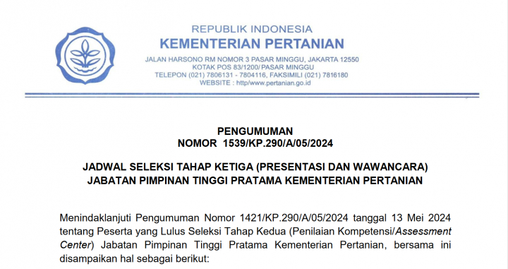 PENGUMUMAN JADWAL SELEKSI TAHAP KETIGA (PRESENTASI DAN WAWANCARA) JABATAN PIMPINAN TINGGI PRATAMA KEMENTERIAN PERTANIAN