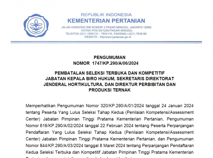 PENGUMUMAN PEMBATALAN SELEKSI TERBUKA DAN KOMPETITIF JABATAN KEPALA BIRO HUKUM, SEKRETARIS DIREKTORAT JENDERAL HORTIKULTURA, DAN DIREKTUR PERBIBITAN DAN PRODUKSI TERNAK