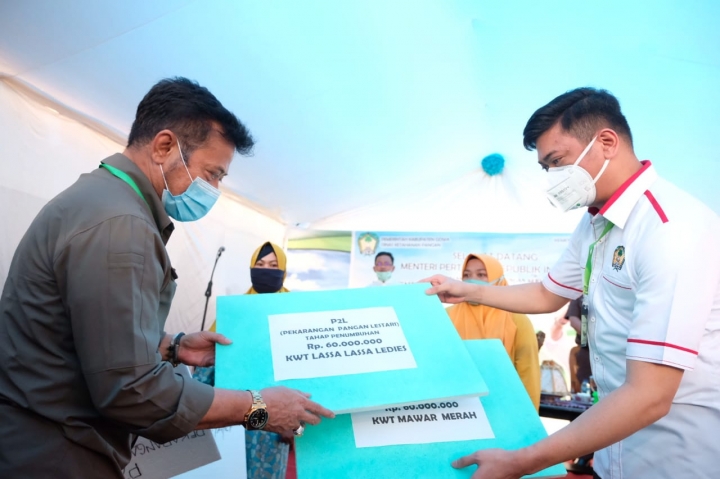 Dalam kunjungan tersebut, SYL berkesempatan menyerahkan paket bantuan Pekarangan Pangan Lestari (P2L) yang diterima langsung oleh Bupati Gowa, Adnan Purichta Ichsan Yasin Limpo.